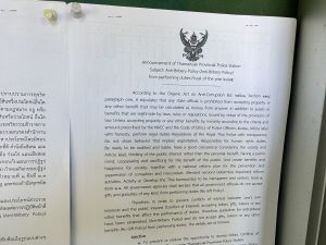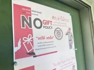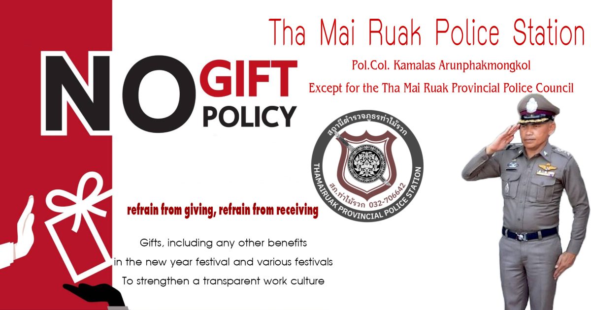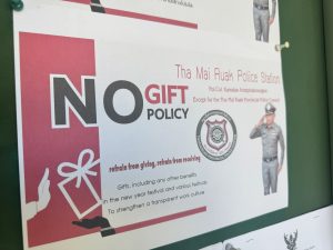ได้ติดป้ายประกาศนโยบายต่อต้านคอรัปชั่น งดให้ งดรับ บนสถานีตำรวจภูธรท่าไม้รวก เพื่อให้ประชาชนที่มาใช้บริการ
