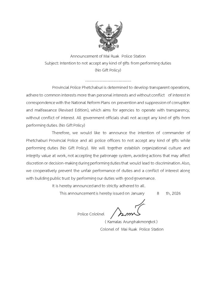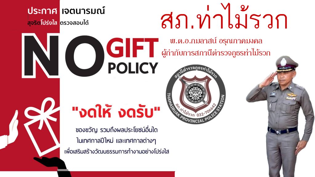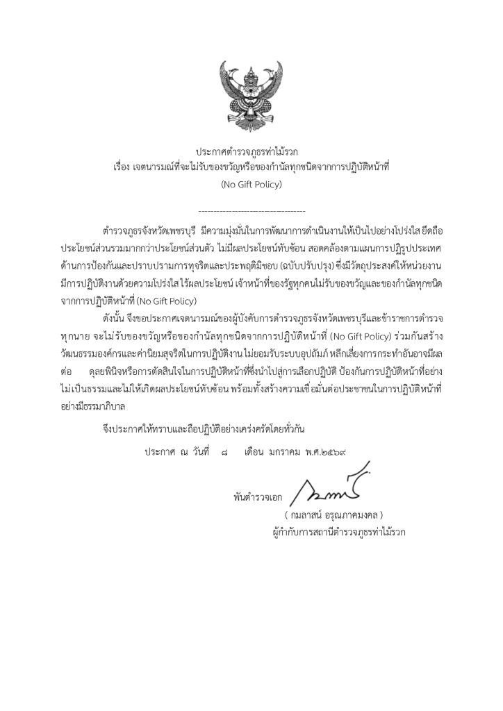 - ประกาศสำนักงานยุทธศาสตร์ตำรวจเรื่องเจตนารมณ์ที่จะไม่รับของขวัญหรือของกำนัลทุกชนิดจากการปฏิบัติหน้าที่